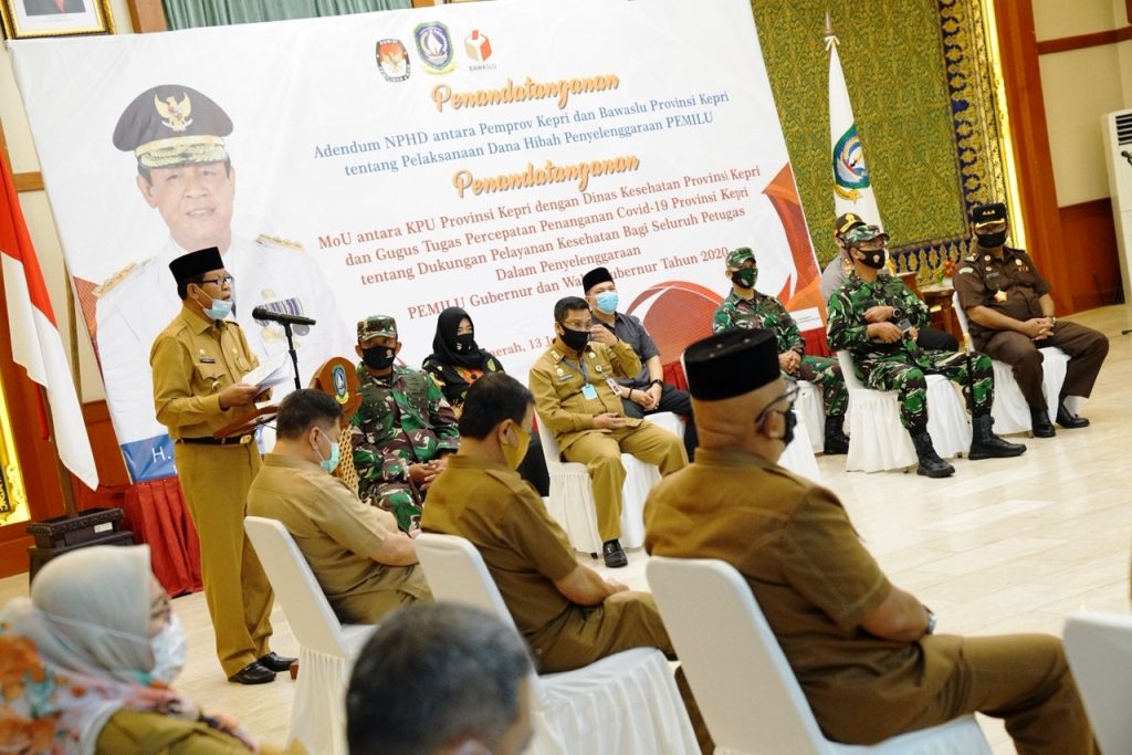Kesiapan ini dituangkan dengan kegiatan penandatanganan adendum NPHD antara Pemerintah Provinsi Kepri dan Bawaslu Kepri tentang pelaksanaan dana hibah penyelenggaraan Pemilu 2020. Serta penandatanganan MoU antara KPU Kepri dan Dinas Kesehatan dan Gugus Tugas Percepatan Penanganan Covid-19 Provinsi Kepri tentang dukungan pelayanan kesehatan bagi seluruh petugas dalam penyelenggaraan Pemilu Gubernur dan Wakil Gubernur tahun 2020. Di Gedung Daerah, Tanjungpinang, Senin, 13 Juli 2020.