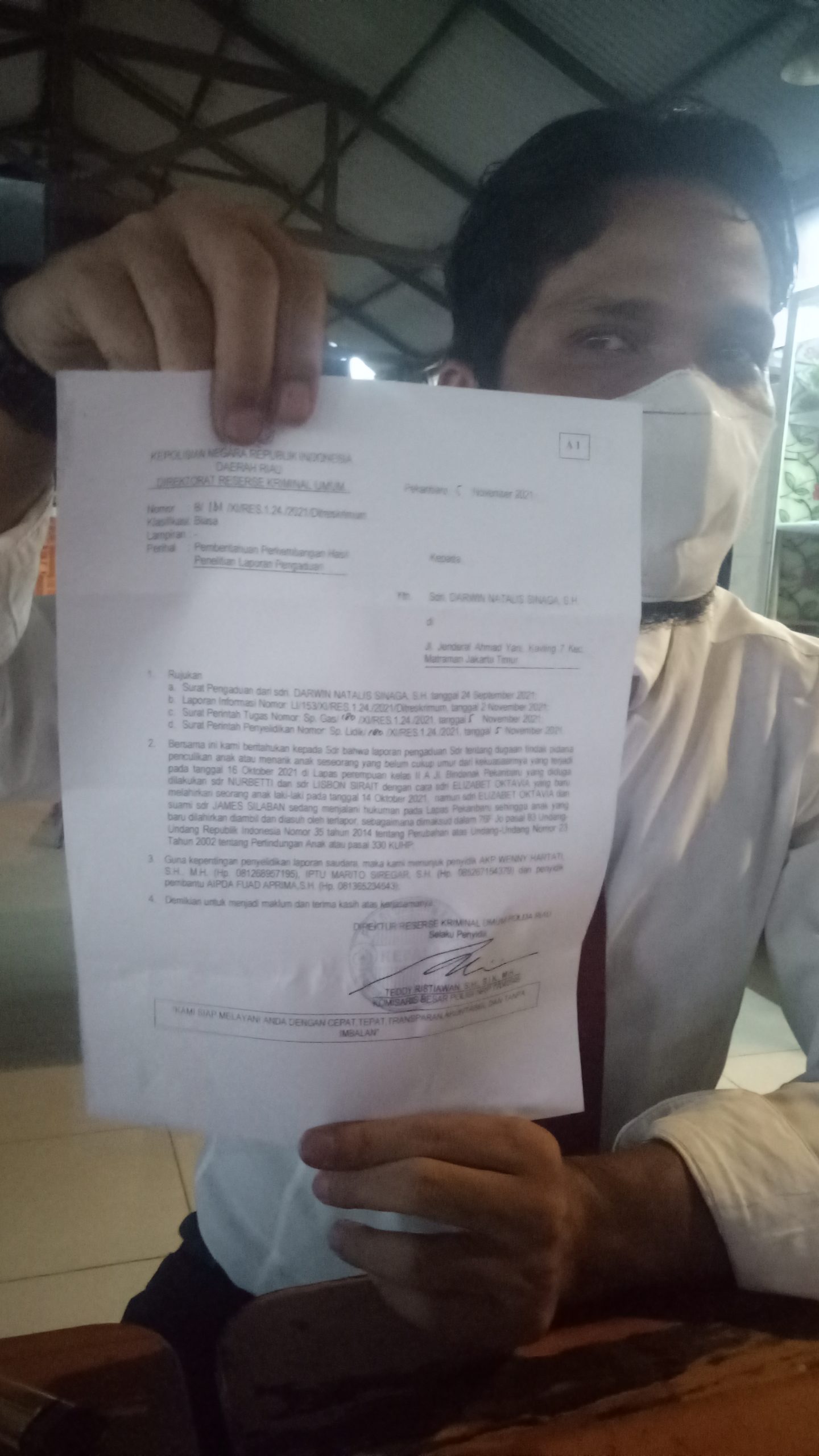 “Pada Minggu lalu, penyidik Subdit IV Ditreskrimum Polda Riau sudah melakukan BAP terhadap klien kita di Lapas Perempuan, dan saya mendampingi proses BAP itu. Dan kita sudah tanyakan kepada penyidik yang mem-BAP klien kita itu. Dan penyidik membenarkan bahwa ada pemeriksaan Lisbon hari ini terkait perkara tersebut. Dan kami melaporkan bapak dan ibunya itu atas dasar permintaan klien kami sebagai ibu dari si anak itu,” beber Darwin.