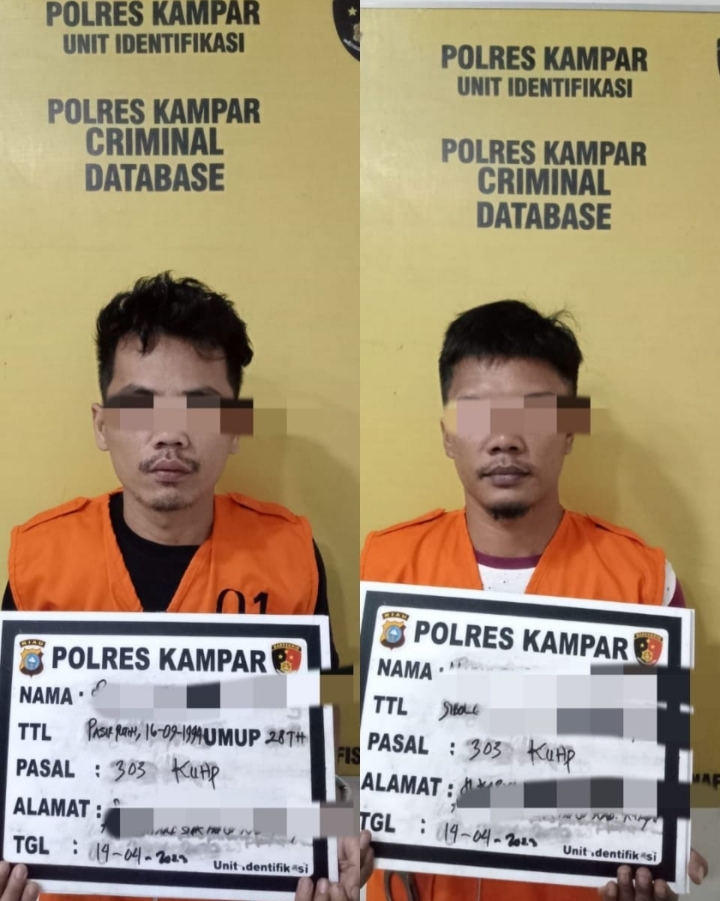 Kapolres Kampar AKBP Didik Priyo Sambodo SIK melalui Kasat Reskrim AKP Aris Gunadi SIK MH, membenarkan penangkapan pelaku ini, “Kedua pelaku dan barang bukti di bawa ke polres Kampar untuk di lakukan pemeriksaan lebih lanjut. Dan mereka ini sudah melanggat pasa 303 KUH Pidana,”tegas Kasat.