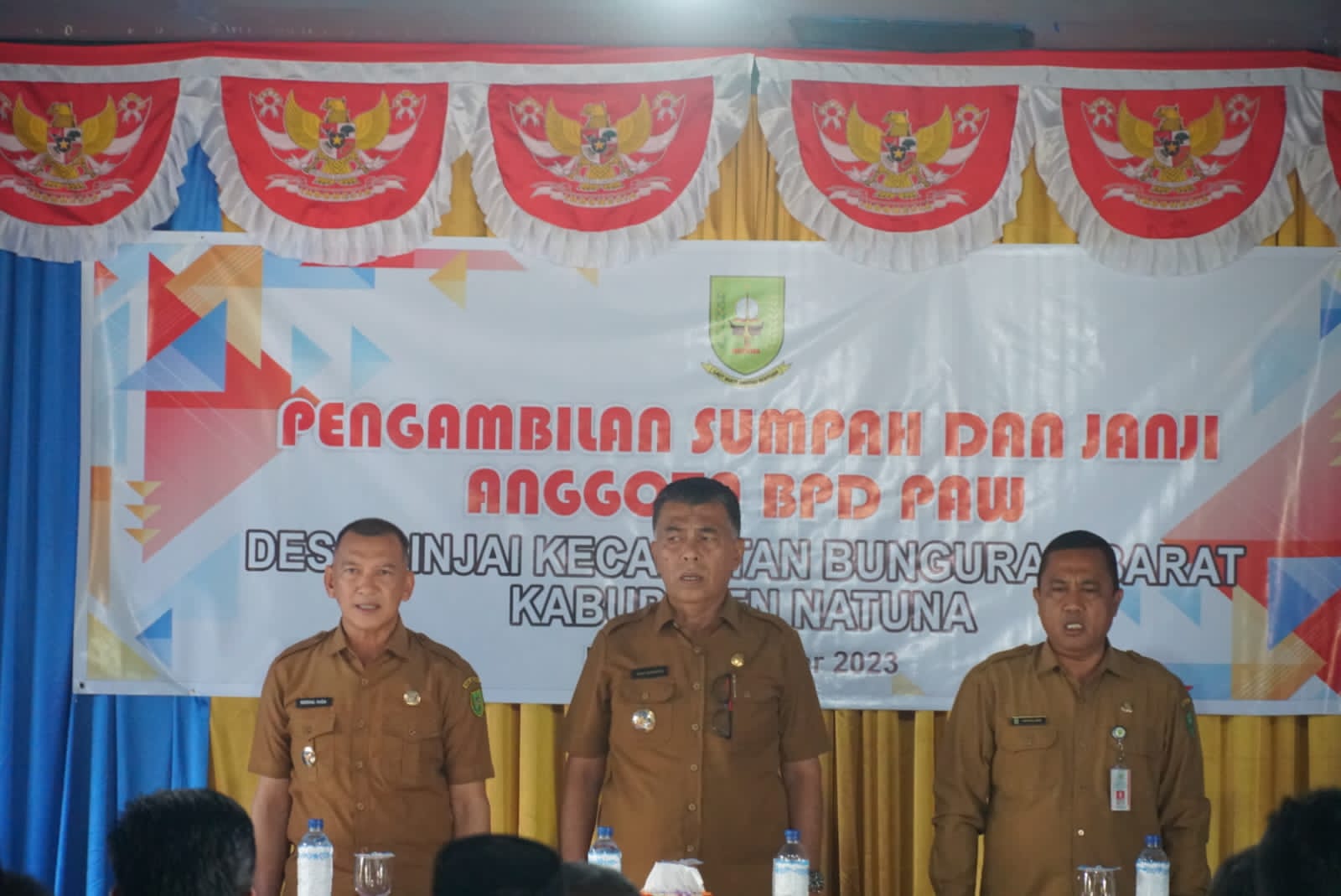 Wahanaindonews.com, Natuna – Bupati Natuna Wan Siswandi didampingi Wakil Bupati Rodhial Huda secara resmi melantik pengganti antar waktu Badan Permusyawaratan Desa Binjai bertempat di Gedung Pertemuan Desa Binjai, Kecamatan Bunguran Barat, Senin, (9/10/2023).