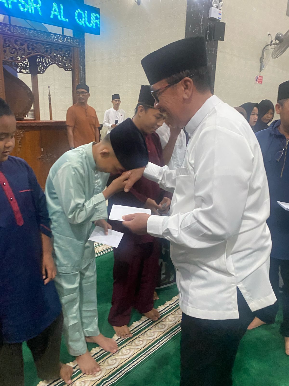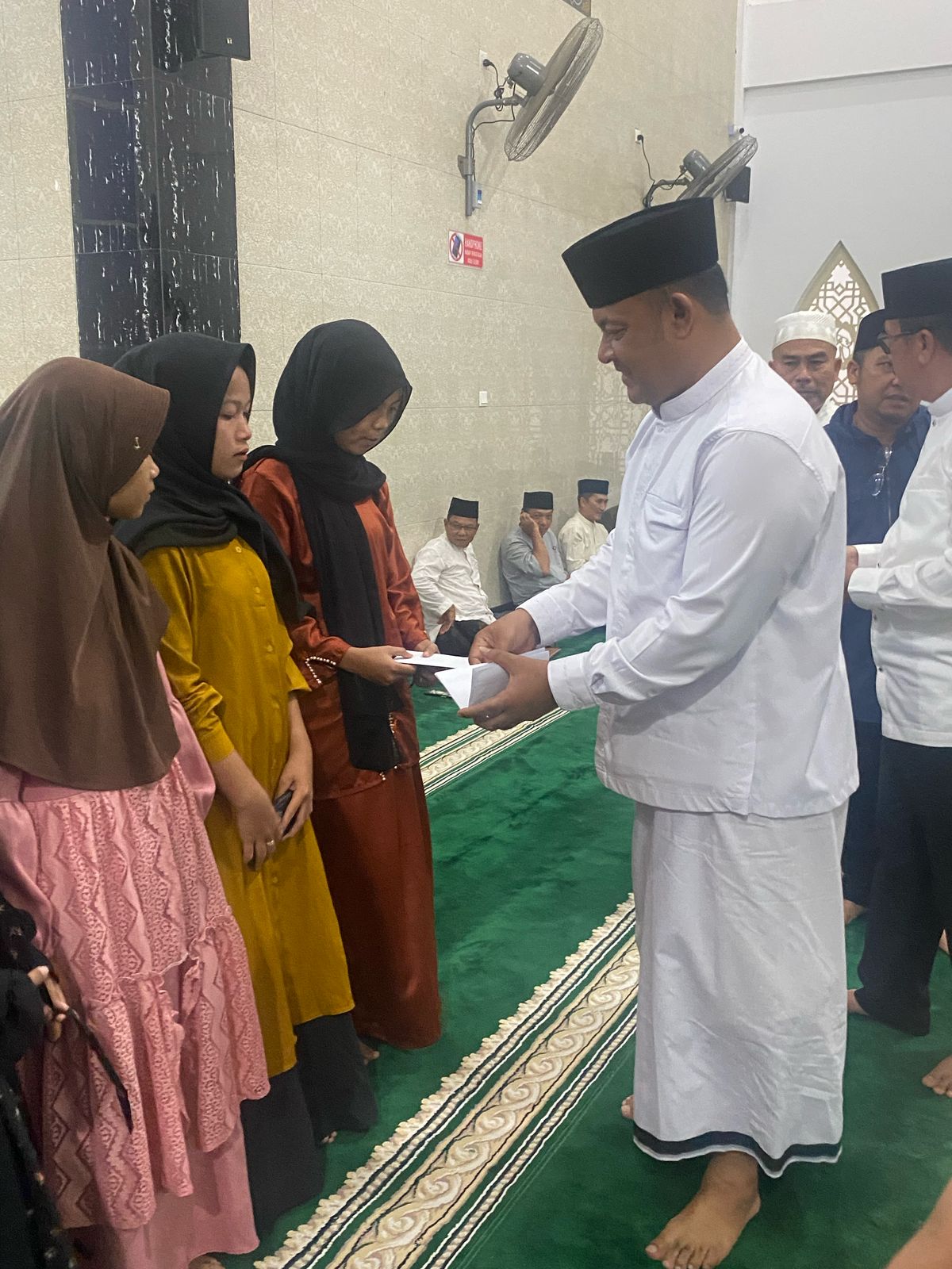 Kendati hujan lebat, namun kehadiran Ketua DPRD Kepri itu disambut hangat jemaat Mesjid. Sementara disisi belakang berjejer puluhan anak yatim piatu.