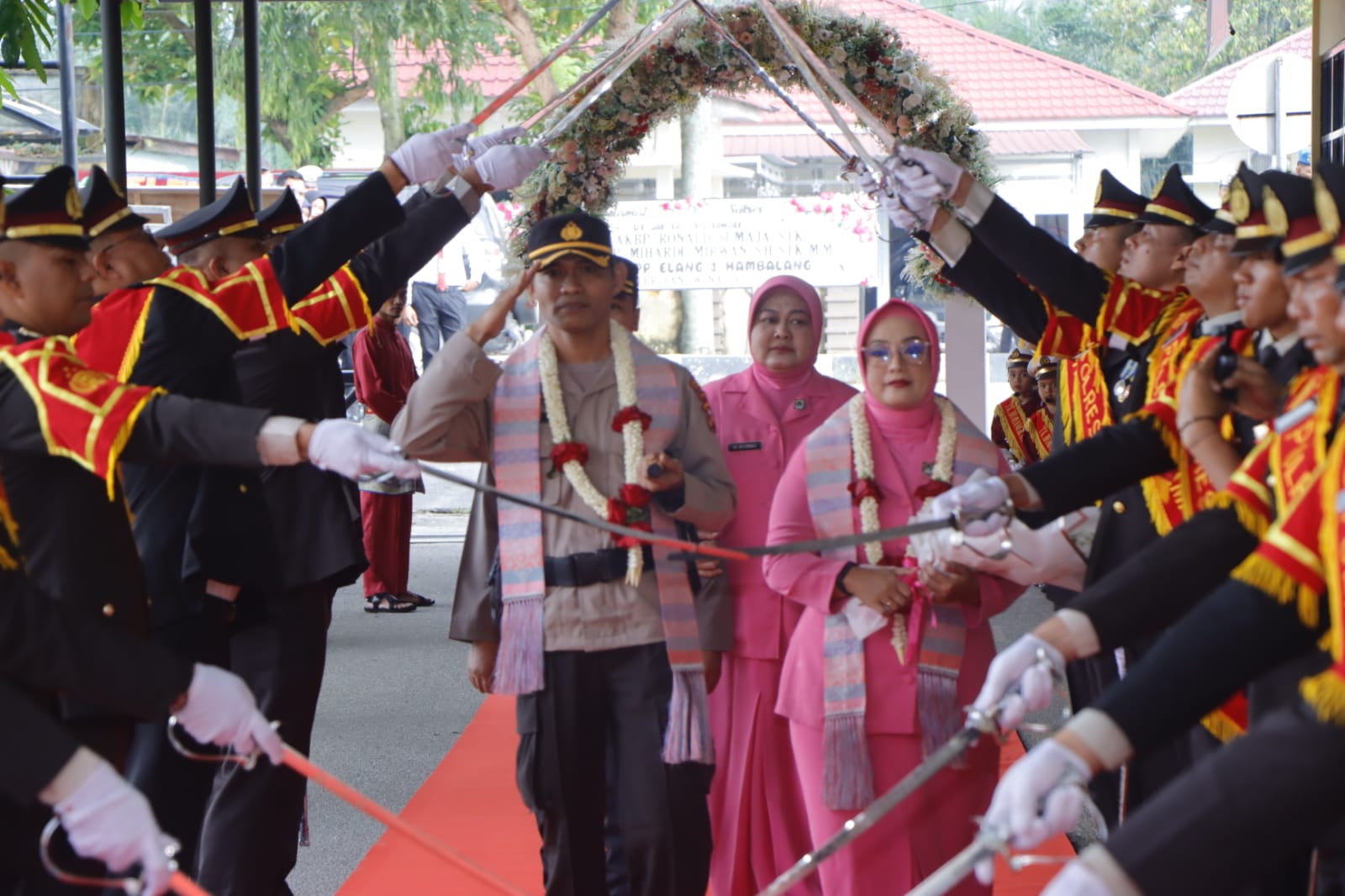 Rangkaian acara diawali pengalungan bunga dan penyerahan buket bunga kepada Kapolres Kampar yang baru dan istri bertempat di Gerbang Masuk Polres Kampar serta disambut acara adat penampilan pencak silat